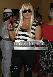 Last nights event was no different. Arriving at her house I entered a new world... cobwebs and spooky photos (think Harry Potter) decorated the walls, black netting hung from the ceiling, the movie Poltergeist flashed on a high wall, and a brew of Black Vodka bubbled away in a decanter next to a plate of white chocolate covered eyeballs. In attendance were Lady Gaga, Paris Hilton in prison garb, vampires Bella and Edward, Dorthy and the Cowardly Lion, a Chilean Miner and his mistress (the wife of the couple was the miner, the husband made a "lovely" mistress!), a magician and his assistant, assorted Top Gun crew and a pair of really tacky Hawaiian tourists.